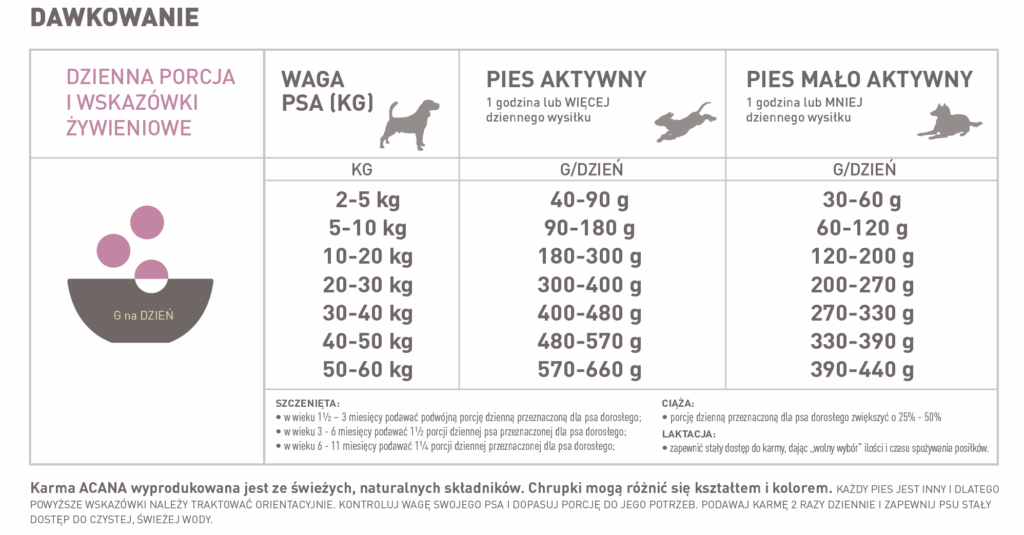 *Każdy pies jest inny, dlatego stosując powyższe wskazówki dawkowania należy traktować orientacyjnie. Kontroluj masę swojego psa i dopasuj porcję do jego potrzeb. Dorosłemu psu podawaj karmę dwa razy dziennie i zapewnij stały dostęp do wody. Używaj standardowej miarki 250 ml/120 g. Jedzenie podawaj na sucho lub lekko zwilżone. Aby zachowywać świeżość zalecamy szczelnie zamknięcie opakowania i przechowywanie w chłodnym, suchym miejscu.