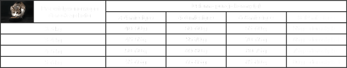 *Każdy kot jest inny, dlatego przedstawione zalecenia należy dostosować do indywidualnych potrzeb, biorąc pod uwagę rasę, wiek, temperament i poziom aktywności danego kota. Przy zmianie karmy, nowy produkt należy przez pierwsze dwa tygodnie wprowadzać stopniowo. Kotu należy zapewnić stały dostęp do świeżej wody. Karma bez dodatku zbóż. Może zawierać śladowe ilości, ponieważ w fabryce używane są zboża. Przechowywać w chłodnym, suchym miejscu. Najlepiej wykorzystać przed: data, numer partii i numer rejestracyjny producenta z tyłu opakowania.