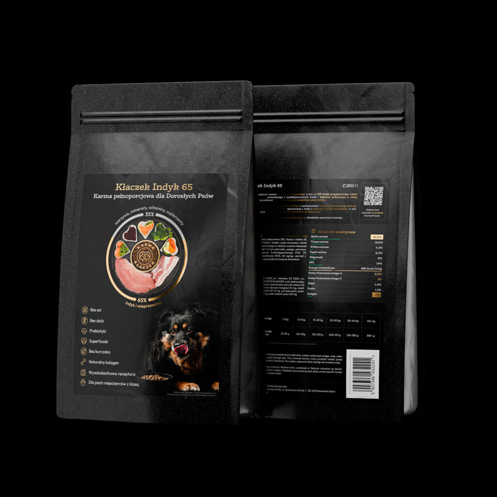 – Uczciwe oznaczenie zawartości – w Karmach Kłaczek ilość świeżego indyka deklarujemy po przygotowaniu, to znaczy po naturalnej, częściowej utracie wody. Nie opieramy się na wartościach surowych, które mogą wyglądać efektownie na etykiecie , lecz po obróbce ich faktyczna zawartość jest znacznie mniejsza.