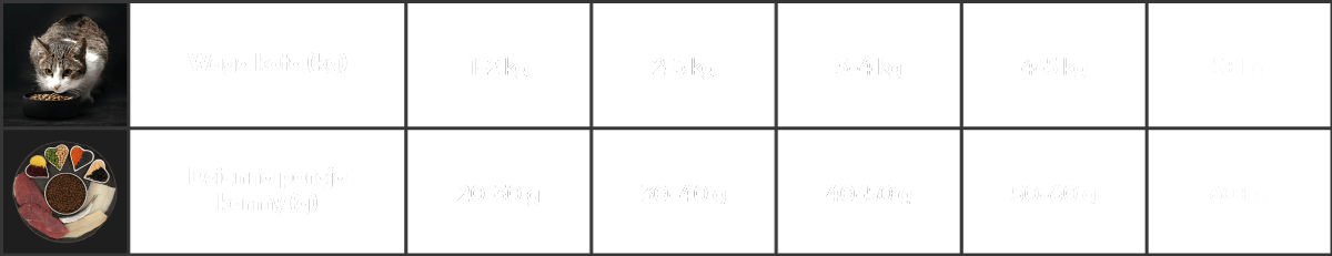 *Każdy kot jest inny, dlatego przedstawione zalecenia należy dostosować do indywidualnych potrzeb, biorąc pod uwagę rasę, wiek, temperament i poziom aktywności danego kota. Przy zmianie karmy, nowy produkt należy przez pierwsze dwa tygodnie wprowadzać stopniowo. Kotu należy zapewnić stały dostęp do świeżej wody. Karma bez dodatku zbóż. Może zawierać śladowe ilości, ponieważ w fabryce używane są zboża. Przechowywać w chłodnym, suchym miejscu. Najlepiej wykorzystać przed: data, numer partii i numer rejestracyjny producenta z tyłu opakowania.