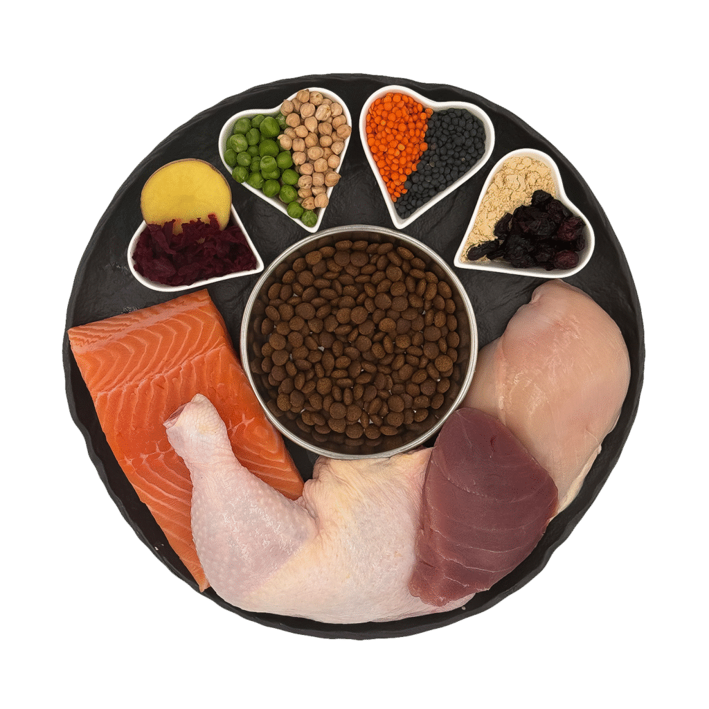 70% kurczaka, tuńczyka i łososia, w tym 26% świeżo przygotowanego kurczaka bez kości i 4% świeżego tuńczyka jakości human grade (przed produkcją), delikatnie gotowanych w niskiej temperaturze dla zachowania wartości odżywczych i wysokiej biodostępności.