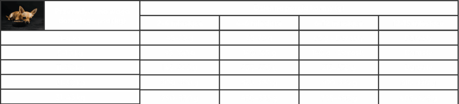 *Każdy pies jest inny, dlatego stosując przedstawione zalecenia, należy wziąć pod uwagę rasę, wiek, temperament i poziom aktywności danego psa. Przy zmianie karmy, nowy produkt należy przez pierwsze dwa tygodnie wprowadzać stopniowo. Psu należy zapewnić stały dostęp do świeżej wody Karma bez dodatku zbóż. Może zawierać śladowe ilości, ponieważ w fabryce używane są zboża. Przechowywać w chłodnym, suchym miejscu. Najlepiej wykorzystać przed: data, numer partii i numer rejestracyjny producenta z tyłu opakowania.