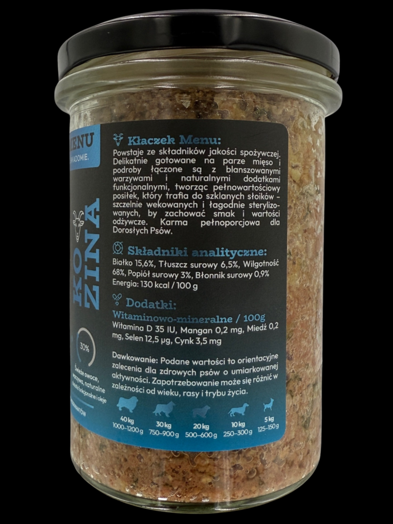 · 70% świeżej koziny delikatnie gotowanej na parze